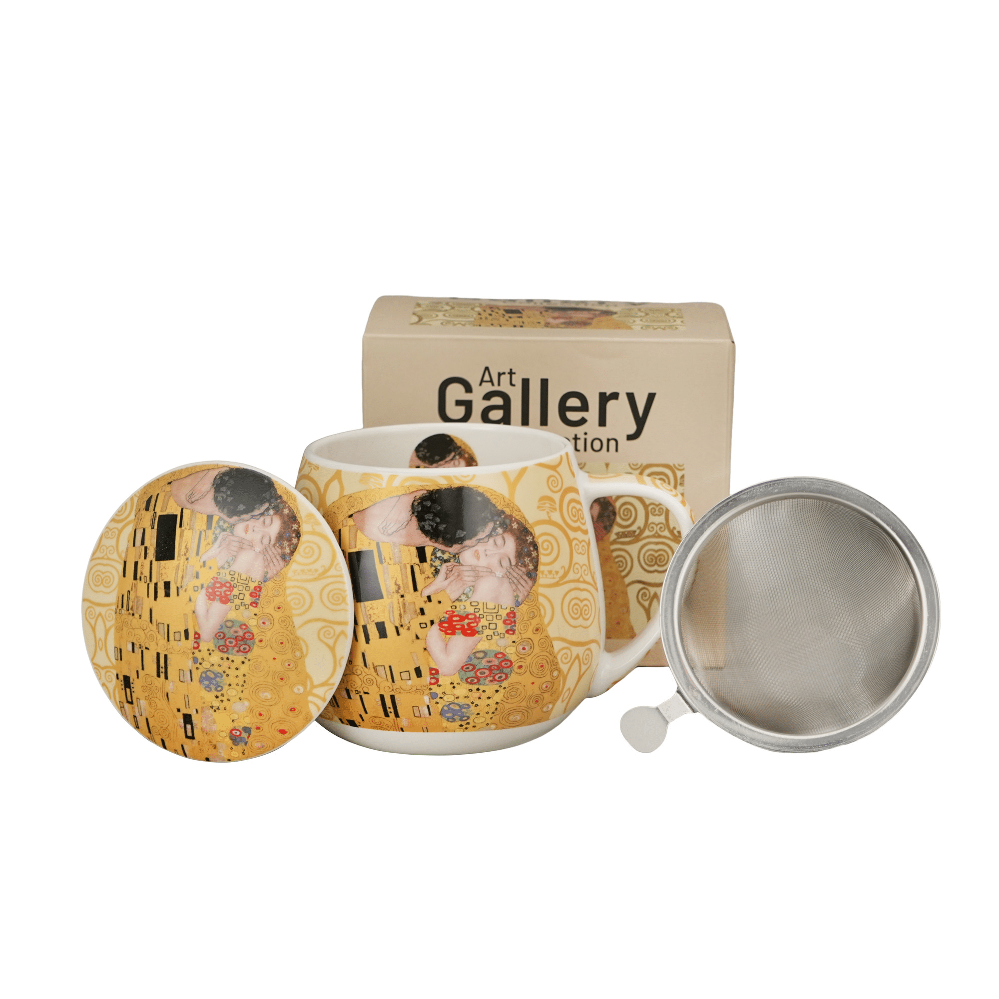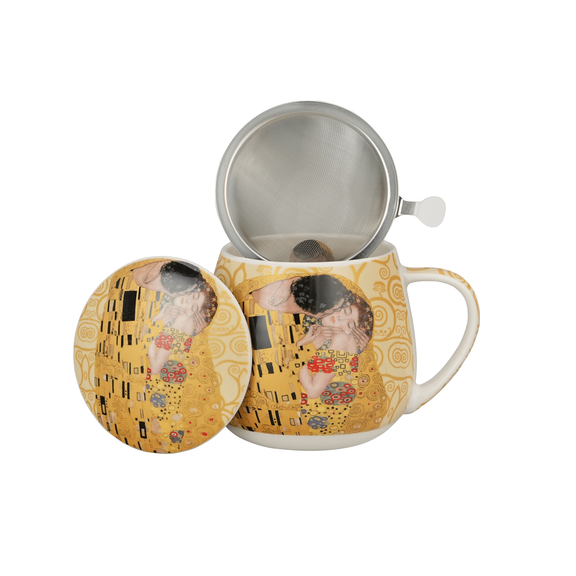 Mug en porcelaine avec filtre et couvercle, inspiré d'un tableau de Gustav Klimt "Le Baiser".