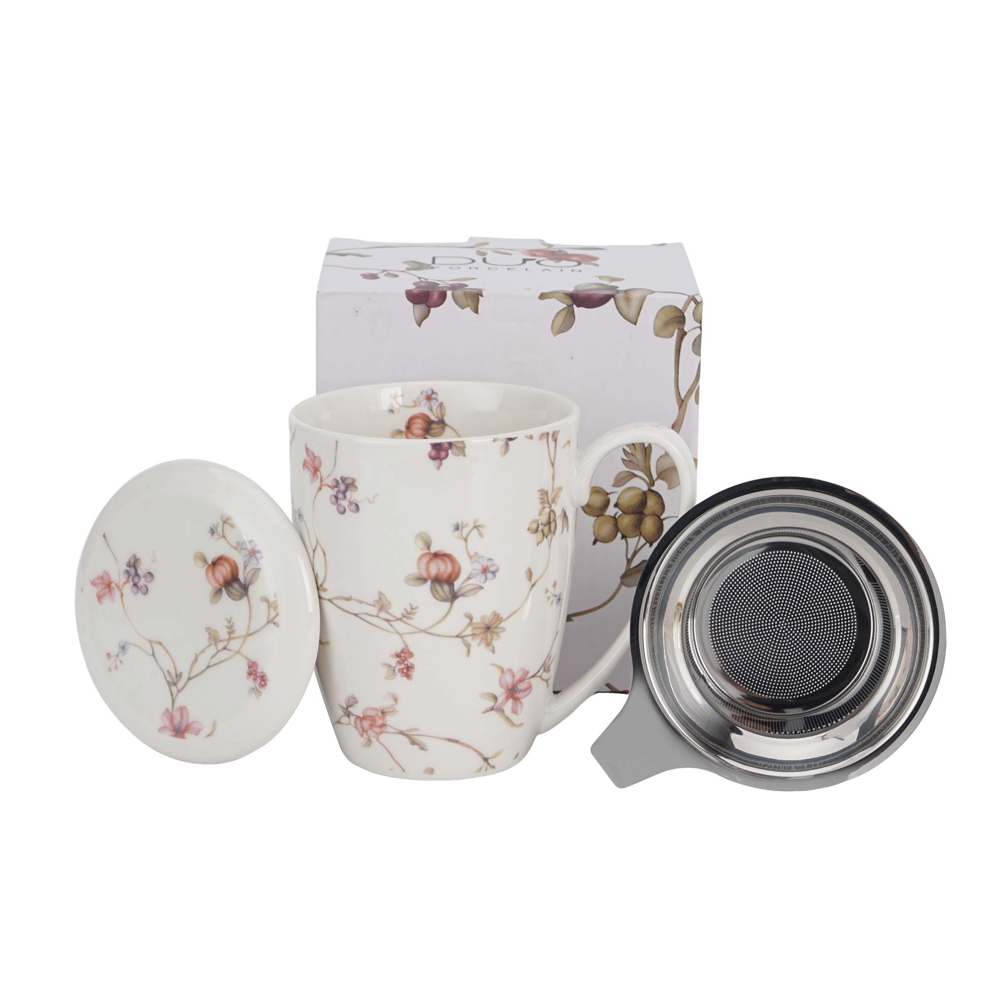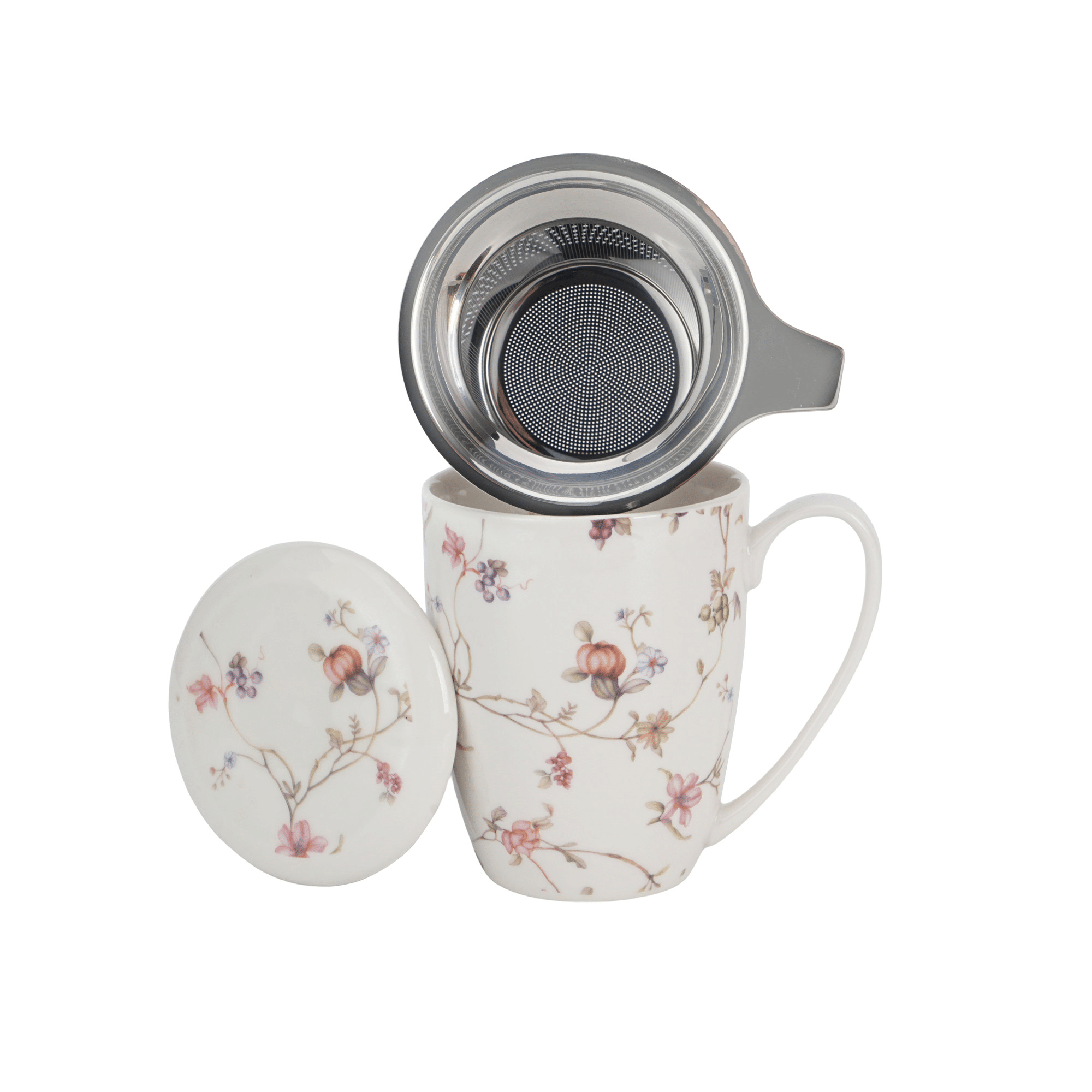 Beau mug en porcelaine motifs lavande, avec filtre inox et couvercle. Délicat et naturellement simple dans sa boite cadeau assortis.